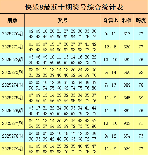 福彩景观8第2025279期开奖回归奖号:01 05 06 14 25 32 35 40 45 47 53 62 63 67 68 70 71 72 75 78,其中奖号奇偶比为11:9,和值为929,跨度为77。