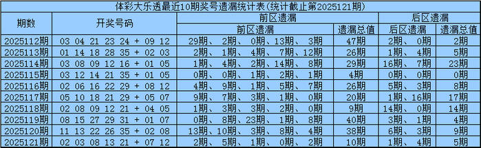体彩大乐透第2025121期开奖总结:前区奖号:02、03、08、13、21,后区奖号07、12,前区前列位遗漏:2期、5期、1期、0期、2期,遗漏总值10期,后区列位遗漏1期和4,遗漏总值 5期。
