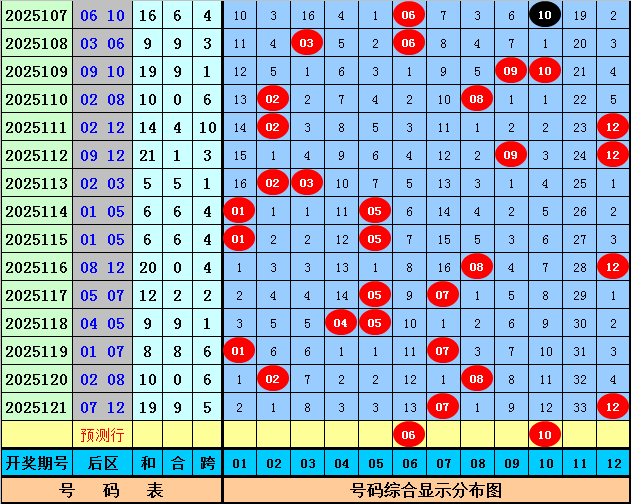 后区奖号分析:上期后区奖号为07+12,遗漏期数为1期和4期,现在后区号码01-12分别遗漏:2期、1期、8期、3期、3期、13期、0期、1期、9期、12期、33期、0期,本期后区堤防号码06、08、10、11、12,两码时势06、10。