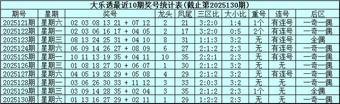 大乐透第2025130期奖号为:01、13、16、27、29+02、11。其中前区三区比为1:2:2,大小比为2:3,莫得出现重号,莫得出现连号,后区为一奇一偶号码。