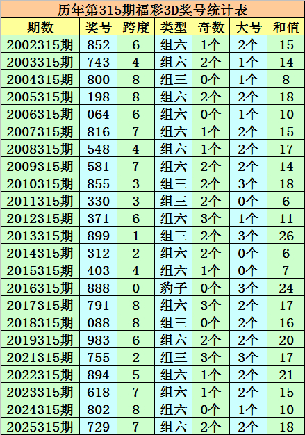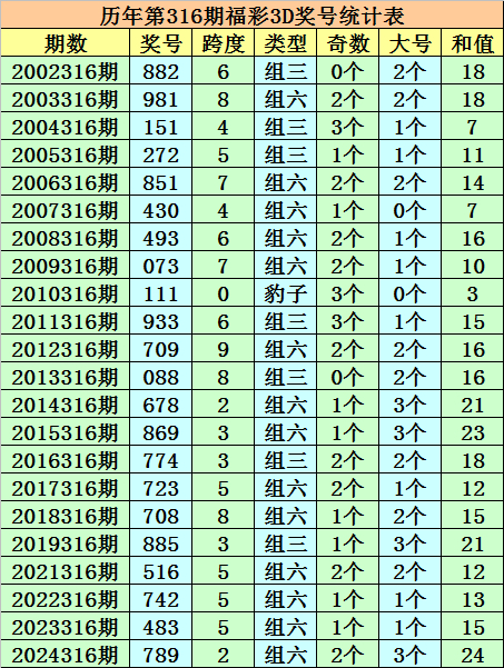 在以上奖号中奖,积年第316期福彩3D出现1次豹子,出现7次组三,出现14次组六。组六开出比例较高,本期连续热心组六。
